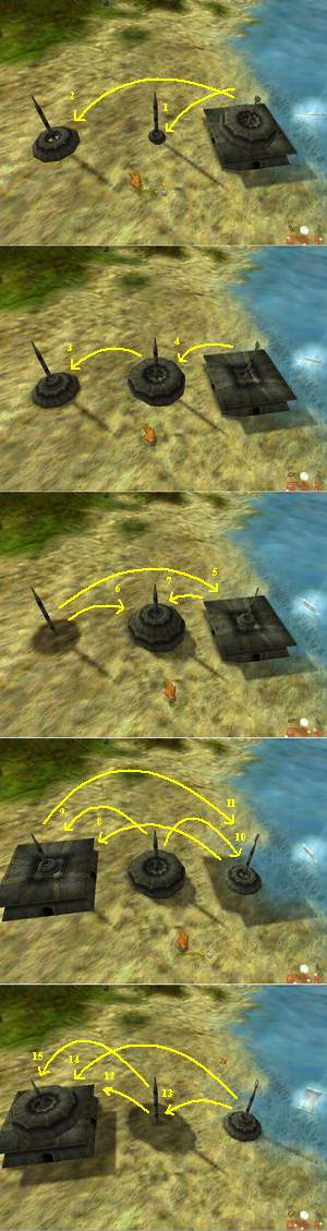 Um an den Wunderspender mit dem Schildzauber zu gelangen muß man die Totems in folgender Reihenfolge ganz nach oben ziehen: