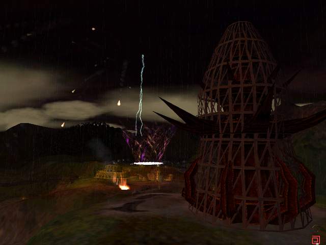 Dich empfängt ein heftiges Unwetter mit Blitzen und Feuerregen. Am Anfang sind die Feuerbälle noch
