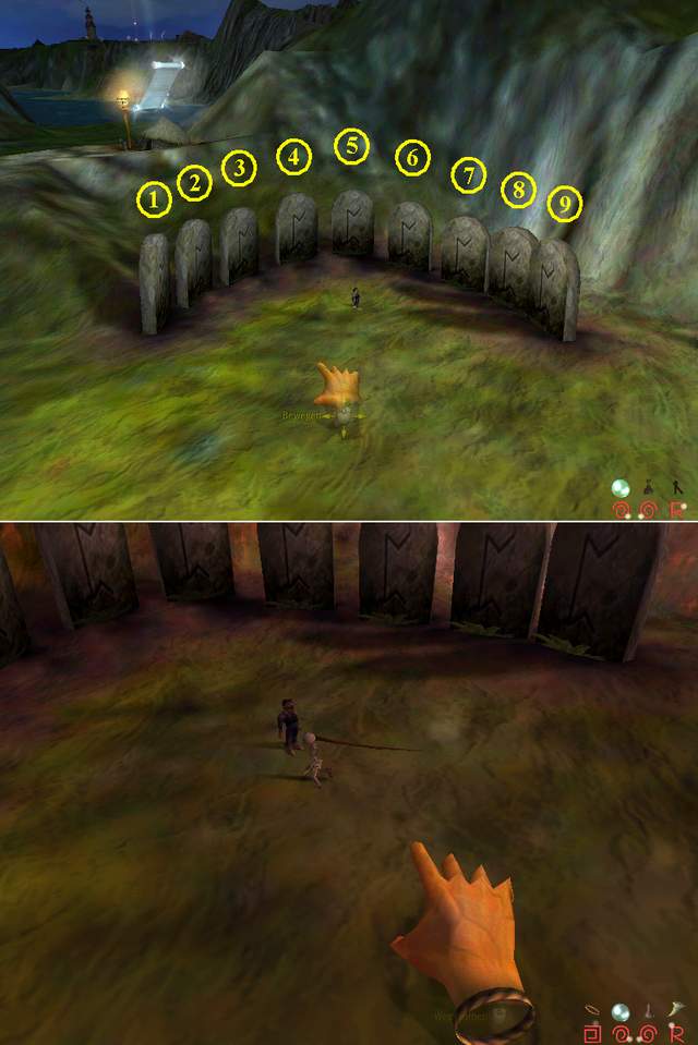 Dadurch wird es sofort dunkel. Denn nur bei Nacht funktioniert die zweite Melodie: 5,5,5,5,8,7,7,5,5,4,5 Als Belohnung könnt Ihr Tote innerhalb des Steinkreises wiederbeleben.