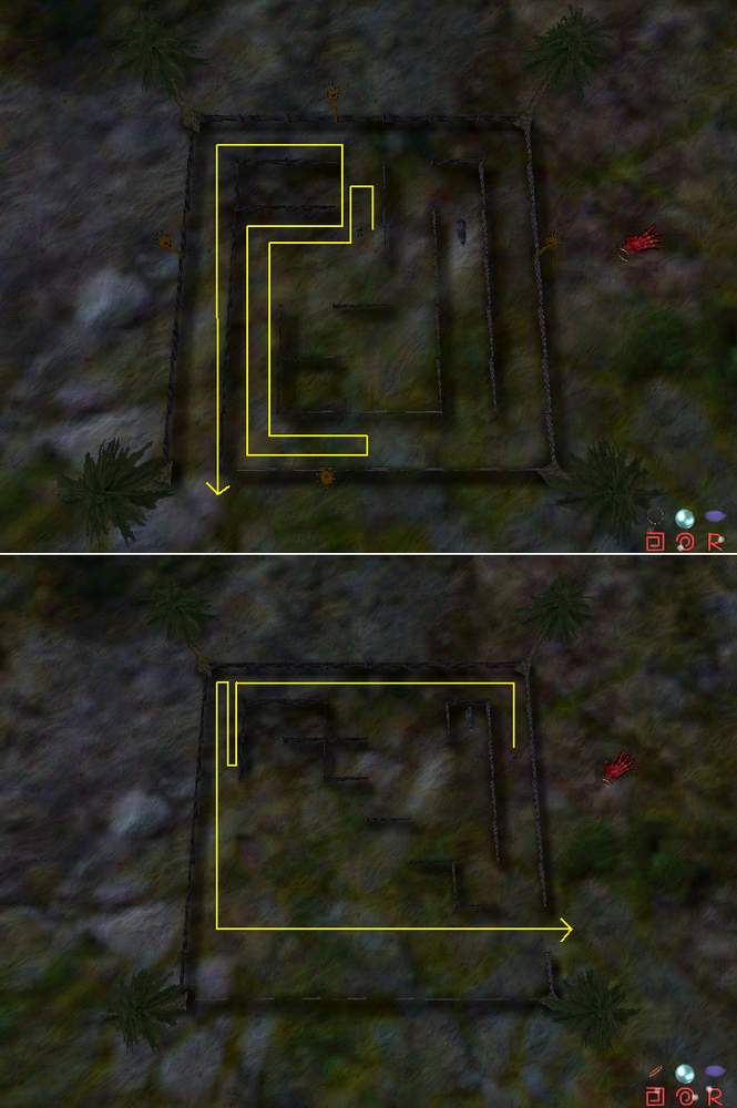 Manövriere den Jungen aus den zwei Labyrinthen. Den Weg sieht man auf dem Bild. Danach kann deine Kreatur den Stärkungszauber und er
